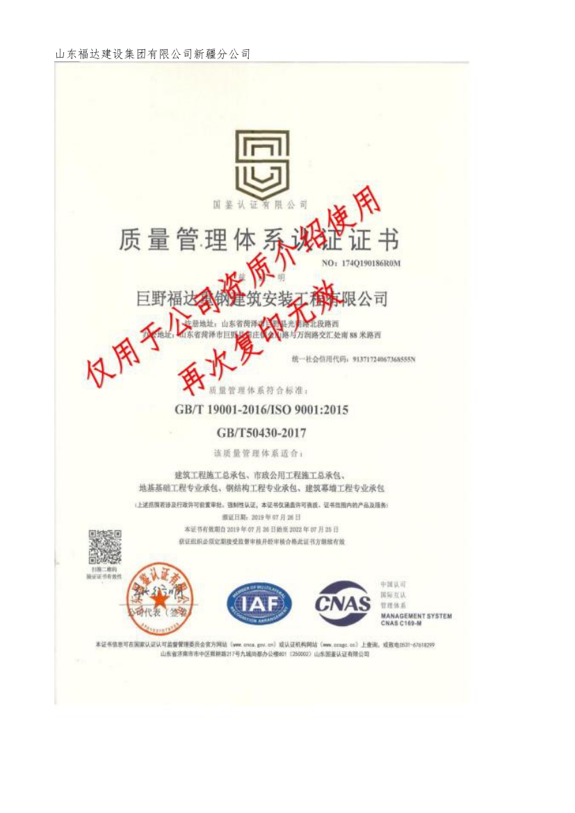 Shandong Fuda Construction Group Co., Ltd. Xinjiang Branch is located in Dafeng Industrial Park, Hutubi County, Changji City, with superior geographical location and convenient transportation. The company covers an area of 56000 square meters, with a production and construction area of 31000 square meters, an annual output value of 150 million yuan, and profits and taxes of 12 million yuan. With over 200 employees, it is a comprehensive modern enterprise that integrates the design, research and development, production, and installation of light steel, heavy steel, steel structure processing, prefabricated buildings, grid structures, curtain walls, and other engineering projects. Our company has complete qualifications, including Level 1 professional contracting for steel structure engineering, Level 2 general contracting for construction engineering, Level 2 professional contracting for building decoration and decoration engineering, Level 2 professional contracting for building curtain wall engineering, Level 3 general contracting for municipal public engineering construction, Level 3 professional contracting for foundation engineering, Level 3 professional contracting for environmental protection engineering, and no classification of construction labor. Achieve an annual production capacity of 60000 tons of prefabricated steel structure accessories. And has passed the IS09001 quality, safety, and environmental three system certification. The company emphasizes the system of quality first and safety accompanying, regularly organizes employee skill training, passes safety positions, improves employee technical skills, and enhances employee safety awareness. The company has an independent production workshop and is equipped with advanced production equipment. In the steel structure processing workshop, the system is standardized, the equipment is complete, and regular safety inspections are carried out. All equipment is inspected monthly to ensure product quality in the workshop processing work. As a key project for attracting investment, it has received high attention from the leaders of the city and county governments. In recent years, while consolidating the market within the province, the company has expanded the market outside the province. While growing bigger and stronger, the company insists on creating a brand with quality, expanding the market with reputation, and seeking development with technology. It maintains good cooperation with many excellent companies